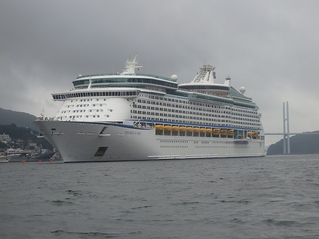 (左)軍艦島に行く前に中国からの豪華客船到着・・・爆買いツアーだそうです